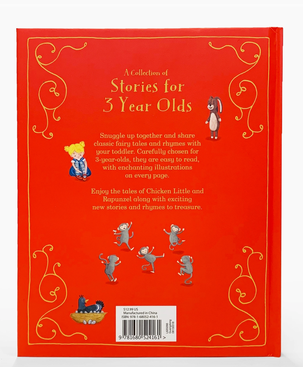 Snuggle up to your favorite nursery rhymes and drift into the magical worlds of all your most beloved fairytale characters with this unique collection of enchanting stories carefully selected to enthrall 3-year-olds. Enjoy the classic tales of chicken little and Rapunzel along with exciting new stories and rhymes in this sturdy collectible format filled with playful illustrations your toddler will adore. A perfect book to celebrate your favorite 3-year-old! Short, easy-to-read stories are ideal for capturing the attention of toddlers. Short stories and rhymes allow adults to adjust how many stories and how much time to spend reading every day.
