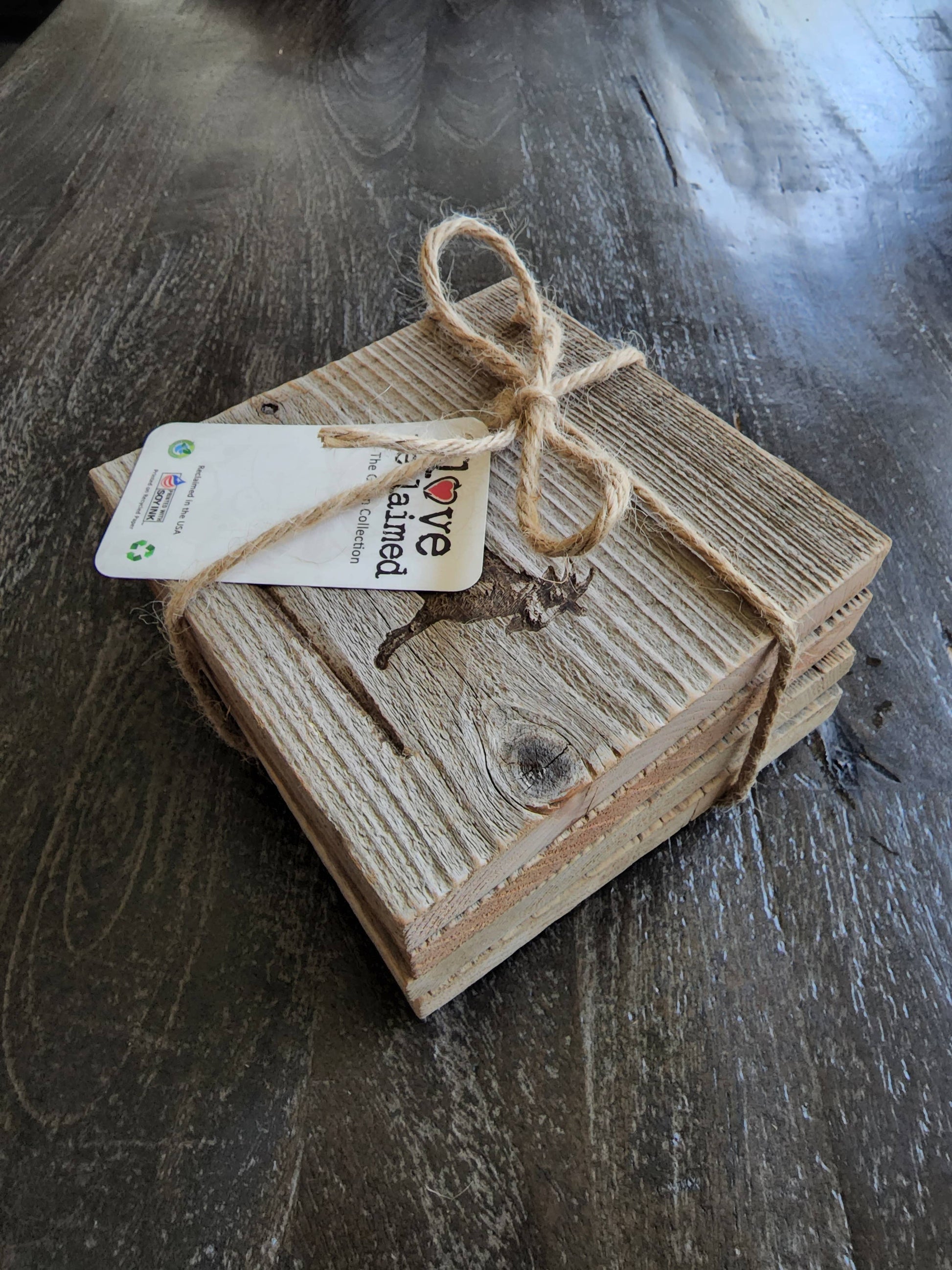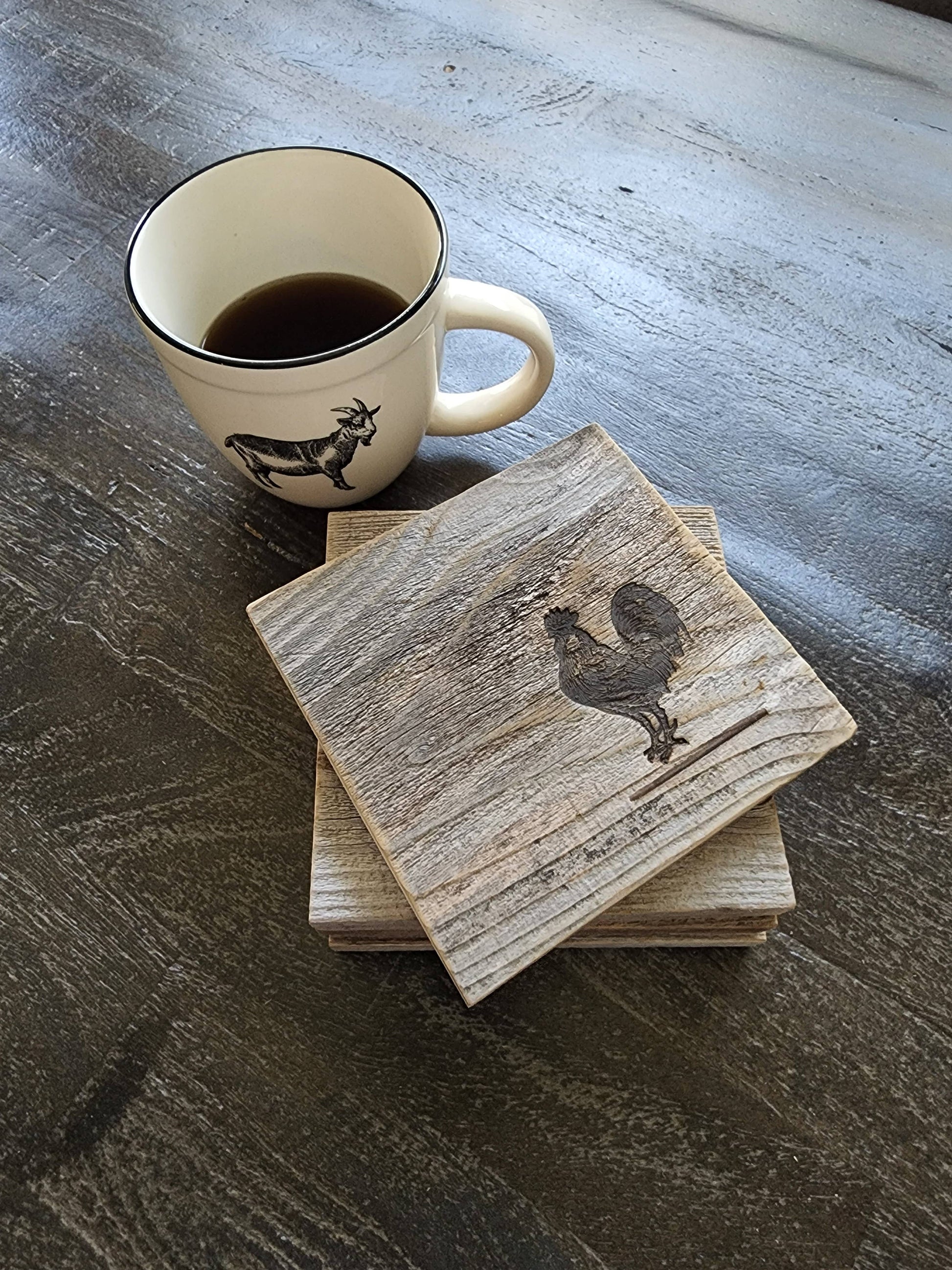 Large coaster set of 4 made from reclaimed wood and lightly sanded to remove rough spots but still maintain the aged reclaimed character of each piece of wood. Due to the nature of the reclaimed material, wood texture and variations will be present in each set. Our classic farm animal icons are branded by hand onto each piece. Each set of 4 includes: 1 cow, 1 goat, 1 pig and 1 rooster. No chemical stains or finishes are added.....these are perfectly fine to get wet, you can use them indoors or out and they are great decorative accents. Paired with a large mug, tea or coffee.....they are also great gift components and can even be used as trivets. Set of 4 comes secured with twine and hang tag.