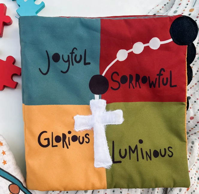 Our brand new quiet book brings the rosary to life for babies and toddlers. With each mystery of the rosary represented, your child will learn the beauty of each decade through play. With fun drawings and interactive, sensory components on each page, the decades are brought to life in a faith based, entertaining way. Each page showcases large black dots representing the Our Father and 10 white dots representing the Hail Mary beads, allowing little fingers to follow along during family prayer. All while allowing visualization of the mystery for a deeper understanding of the rosary. Our rosary quiet book is the perfect addition to your Mass bag, night time routine, family prayer, or anytime your child needs a play.