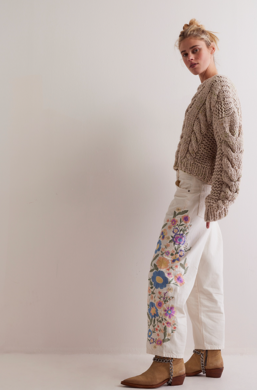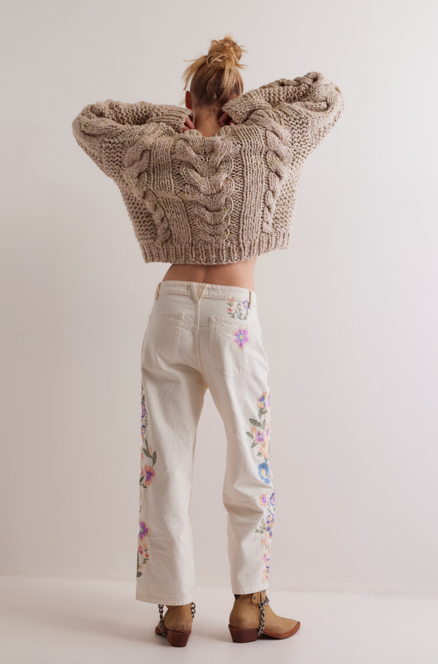 A perfect combo of playful and delicate, these jeans are a relaxed, boyfriend fit features bold embroidered flowers. Structured in a rigid cotton fabric and button-fly at the waist, its the pant your basic top has been waiting to be paired with.